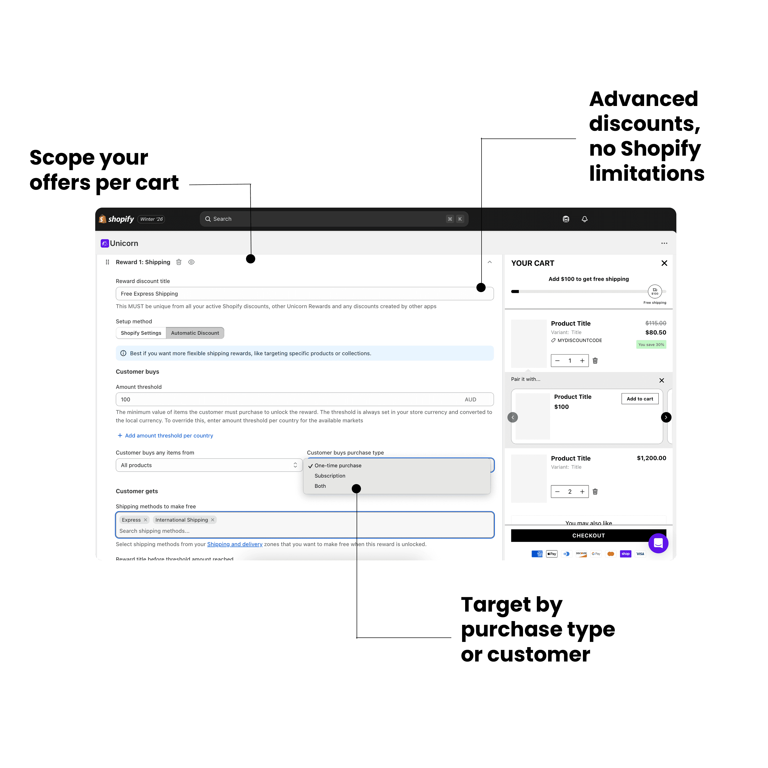 Trusted by top Shopify brands, Unicorn comes with AOV boosting features like Tiered Progress Bar, Announcement Banner, Countdowns Timers, Spend and Save, Gift with Purchase, AI-Powered Upsells, Upgrade-to-Subscription and more.